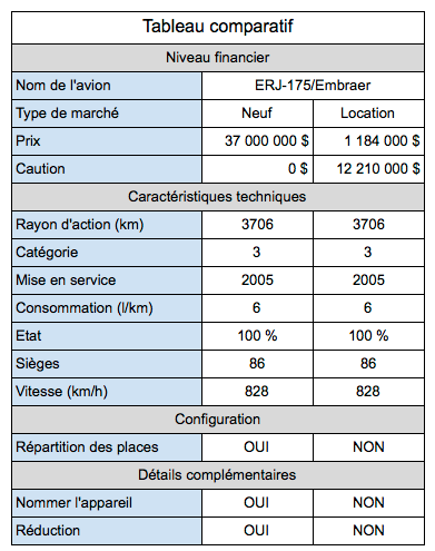 - On choisit de comparer l’Embraer ERJ-175 que nous pouvons acheter neuf ou en location.